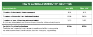 Gold and Silver HSA OpportunityIn addition to gift card rewards, those enrolled in a Gold HSA or Silver HSA plan can earn HSA contributions by completing all three activities listed in the table below. You’ll earn a portion of your HSA incentive as you complete each one.