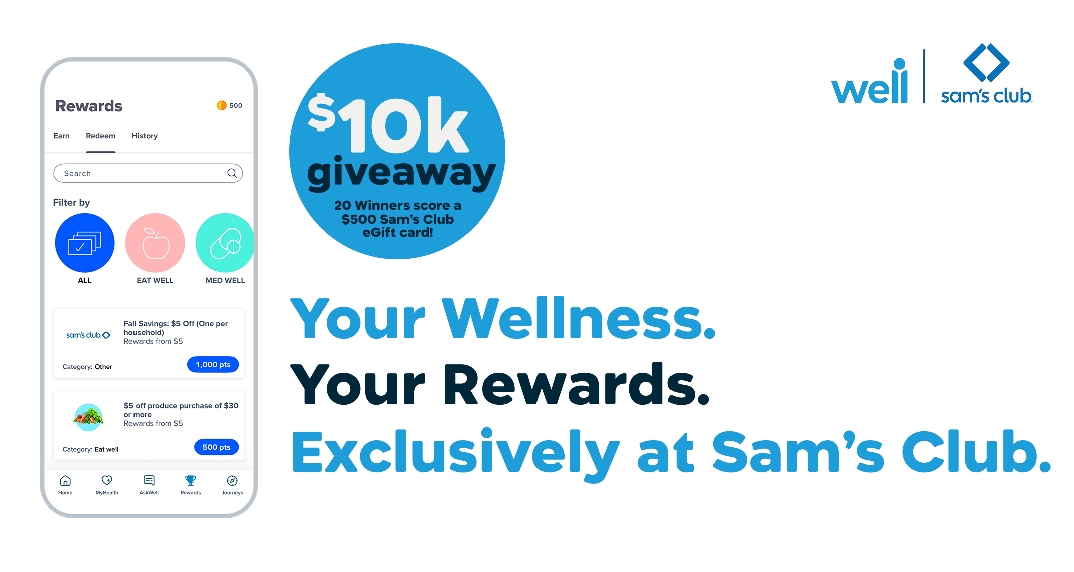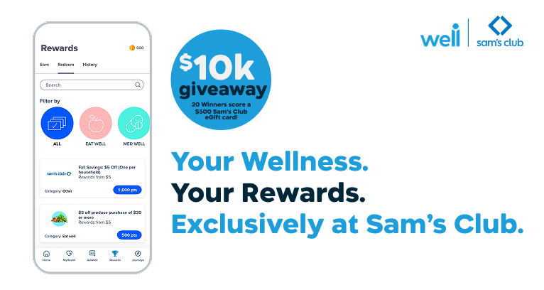 Join thousands of members already earning points for simple wellness actions. Redeem for exclusive rewards at Sam’s Club, like $5 off your next in-club purchase. For a limited time, 20 Sam’s Club Members win $500 in eGift cards each month – earn entries by simply completing actions in the Well app.